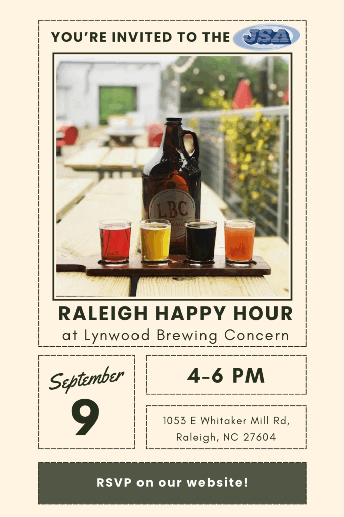 Raleigh Happy Hour 2025 Join Us for a Happy Hour in Raleigh!Name *Email *How Many Guests Are You Bringing? (Including Yourself) *RSVP!Thank you for your RSVP! We look forward to seeing you!×There was an error trying to send your message. Please try again later.× Molly Johnson2025-09-04T10:57:43-04:00August 21st, 2025|0 Comments Share This Story, Choose Your Platform! FacebookXLinkedInEmail Related Posts Changes to Phone System March 26th, 2024 JSA 2023 Christmas Party December 13th, 2023 Christmas Card 2023 December 11th, 2023 JSA 2022 Basketball Contest March 23rd, 2022 Protected: Ethical Culture and Its E&O Impact June 10th, 2021